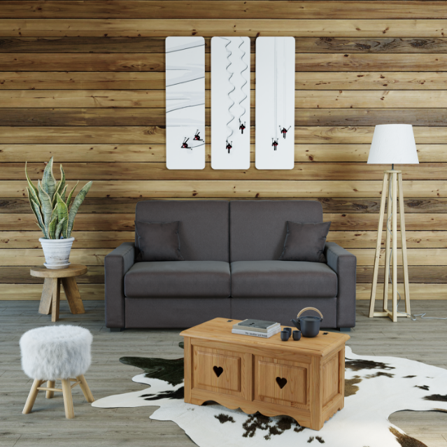 Les meubles Grenier Alpin en bois massif allient simplicité et robustesse reflétant l'harmonie entre confort et traditions montagnardes.